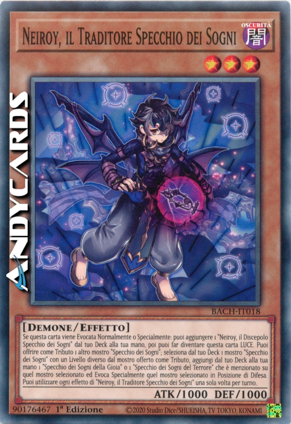 Se questa carta viene Evocata Normalmente o Specialmente: puoi aggiungere 1 "Neiroy, il Discepolo Specchio dei Sogni" dal tuo Deck alla tua mano, poi puoi far diventare questa carta LUCE. Puoi offrire come Tributo 1 altro mostro "Specchio dei Sogni"; seleziona dal tuo Deck 1 mostro "Specchio dei Sogni" con un Livello diverso dal mostro offerto come Tributo, aggiungi dal tuo Deck alla tua mano 1 "Specchio dei Sogni della Gioia" o 1 "Specchio dei Sogni del Terrore" che è menzionato su quel mostro selezionato ed Evoca Specialmente quel mostro selezionato in Posizione di Difesa. Puoi utilizzare ogni effetto di "Neiroy, il Traditore Specchio dei Sogni" una sola volta per turno.