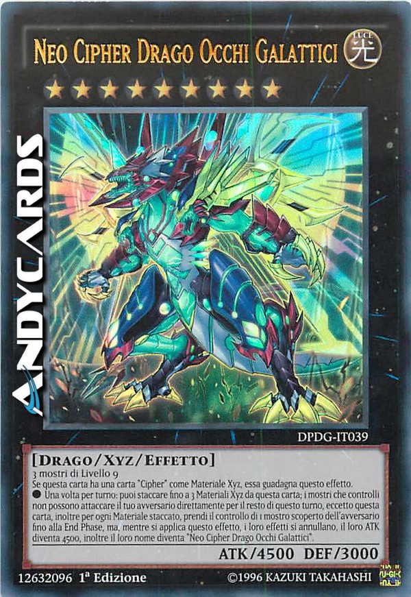 3 mostri di Livello 9 - Se questa carta ha una carta "Cipher" come Materiale Xyz, essa guadagna questo effetto. - Una volta per turno: puoi staccare fino a 3 Materiali Xyz da questa carta; i mostri che controlli non possono attaccare il tuo avversario direttamente per il resto di questo turno, eccetto questa carta, inoltre per ogni Materiale staccato, prendi il controllo di 1 mostro scoperto dell'avversario fino alla End Phase, ma, mentre si applica questo effetto, i loro effetti si annullano, il loro ATK diventa 4500, inoltre il loro nome diventa "Neo Cipher Drago Occhi Galattici".