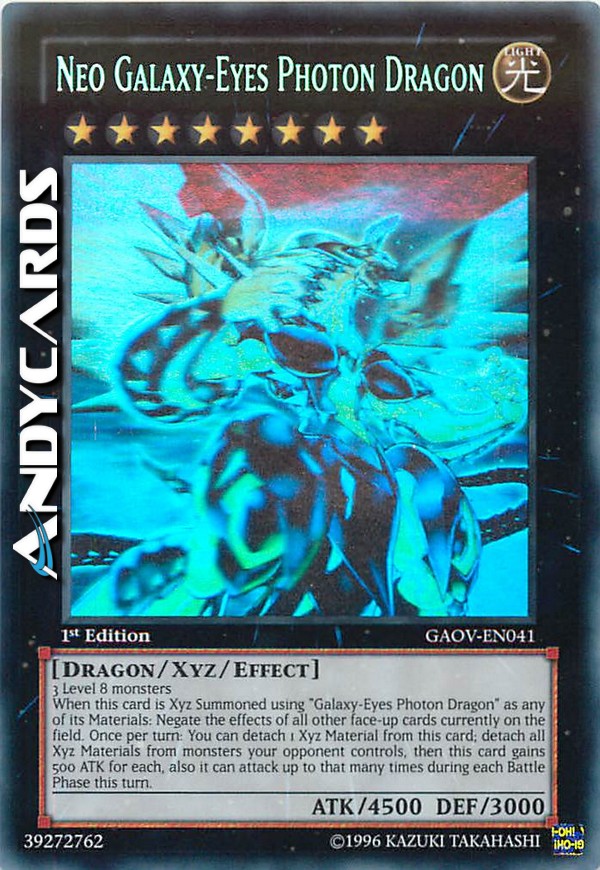 If this card is Xyz Summoned using "Galaxy-Eyes Photon Dragon" as any of its materials: Negate the effects of all other face-up cards currently on the field. Once per turn: You can detach 1 material from this card; detach all materials from monsters your opponent controls, then this card gains 500 ATK for each, also it can attack up to that many times during each Battle Phase this turn.