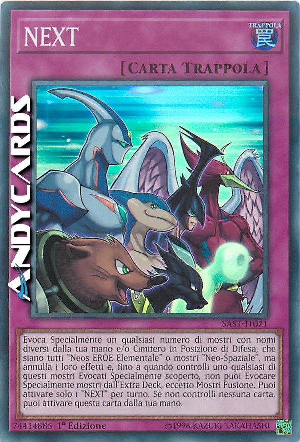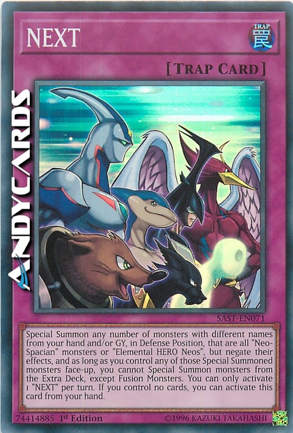 Evoca Specialmente un qualsiasi numero di mostri con nomi diversi dalla tua mano e/o Cimitero in Posizione di Difesa, che siano tutti "Neos EROE Elementale" o mostri "Neo-Spaziale", ma annulla i loro effetti e, fino a quando controlli uno qualsiasi di questi mostri Evocati Specialmente scoperto, non puoi Evocare Specialmente mostri dall'Extra Deck, eccetto Mostri Fusione. Puoi attivare solo 1 "NEXT" per turno. Se non controlli nessuna carta, puoi attivare questa carta dalla tua mano.
