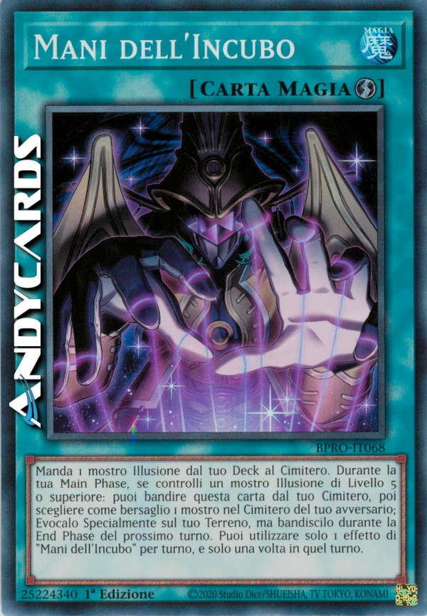 Manda 1 mostro Illusione dal tuo Deck al Cimitero. Durante la tua Main Phase, se controlli un mostro Illusione di Livello 5 o superiore: puoi bandire questa carta dal tuo Cimitero, poi scegliere come bersaglio 1 mostro nel Cimitero del tuo avversario; Evocalo Specialmente sul tuo Terreno, ma bandiscilo durante la End Phase del prossimo turno. Puoi utilizzare solo 1 effetto di "Mani dell'Incubo" per turno, e solo una volta in quel turno.