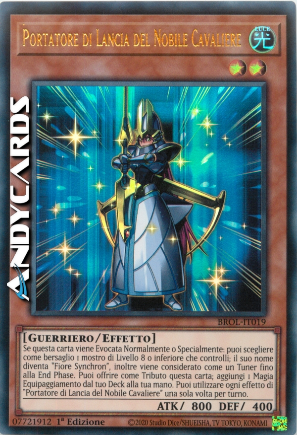 Se questa carta viene Evocata Normalmente o Specialmente: puoi scegliere come bersaglio 1 mostro di Livello 8 o inferiore che controlli; il suo nome diventa "Fiore Synchron", inoltre viene considerato come un Tuner fino alla End Phase. Puoi offrire come Tributo questa carta; aggiungi 1 Magia Equipaggiamento dal tuo Deck alla tua mano. Puoi utilizzare ogni effetto di "Portatore di Lancia del Nobile Cavaliere" una sola volta per turno.