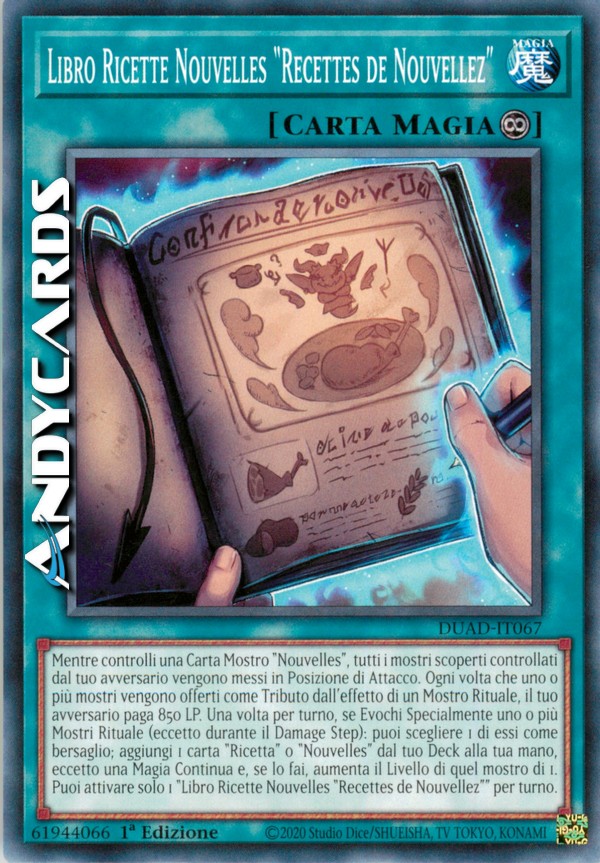 Mentre controlli una Carta Mostro "Nouvelles", tutti i mostri scoperti controllati dal tuo avversario vengono messi in Posizione di Attacco. Ogni volta che uno o più mostri vengono offerti come Tributo dall'effetto di un Mostro Rituale, il tuo avversario paga 850 LP. Una volta per turno, se Evochi Specialmente uno o più Mostri Rituale (eccetto durante il Damage Step): puoi scegliere 1 di essi come bersaglio; aggiungi 1 carta "Ricetta" o "Nouvelles" dal tuo Deck alla tua mano, eccetto una Magia Continua e, se lo fai, aumenta il Livello di quel mostro di 1. Puoi attivare solo 1 "Libro Ricette Nouvelles "Recettes de Nouvellez"" per turno.