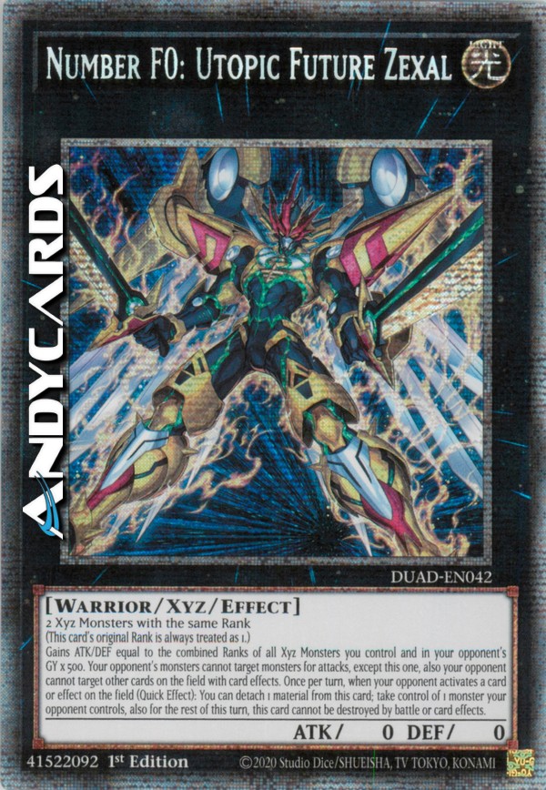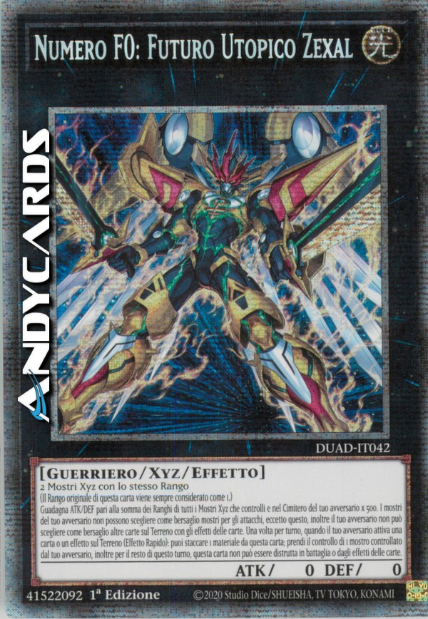 Guadagna ATK/DEF pari alla somma dei Ranghi di tutti i Mostri Xyz che controlli e nel Cimitero del tuo avversario x 500. I mostri del tuo avversario non possono scegliere come bersaglio mostri per gli attacchi, eccetto questo, inoltre il tuo avversario non può scegliere come bersaglio altre carte sul Terreno con gli effetti delle carte. Una volta per turno, quando il tuo avversario attiva una carta o un effetto sul Terreno (Effetto Rapido): puoi staccare 1 materiale da questa carta; prendi il controllo di 1 mostro controllato dal tuo avversario, inoltre per il resto di questo turno, questa carta non può essere distrutta in battaglia o dagli effetti delle carte.