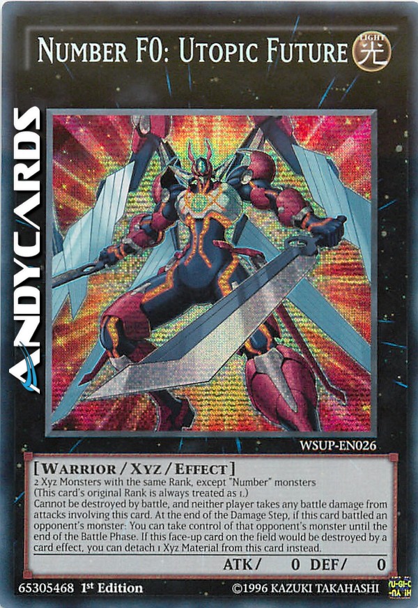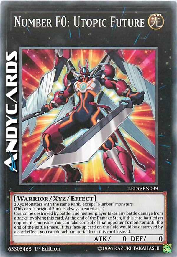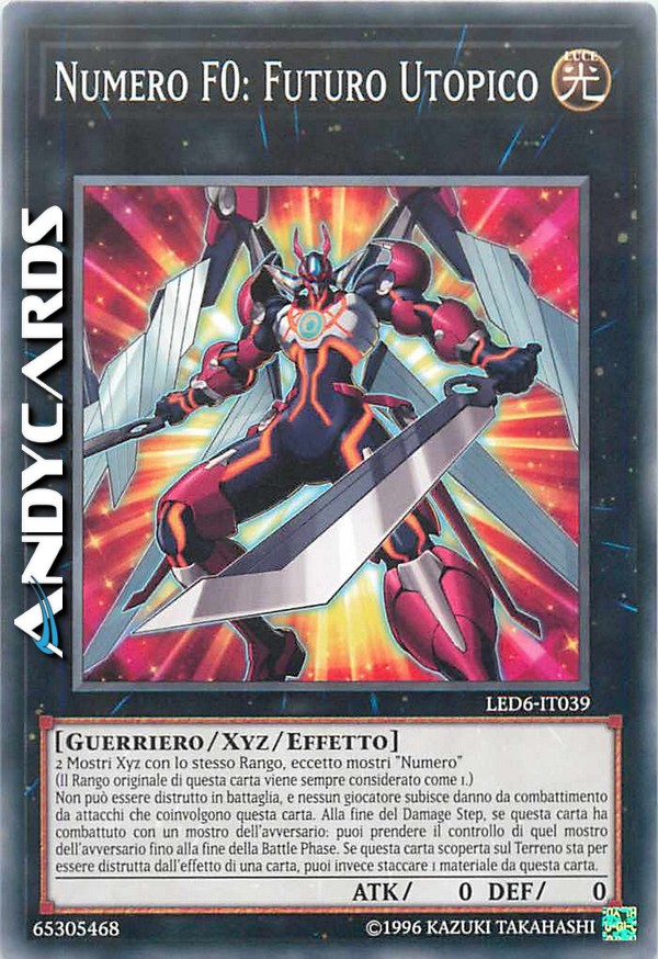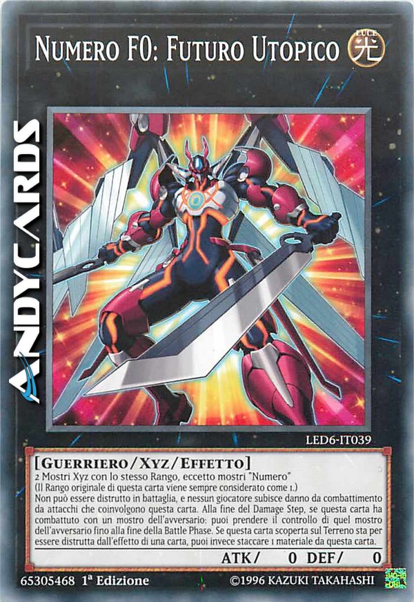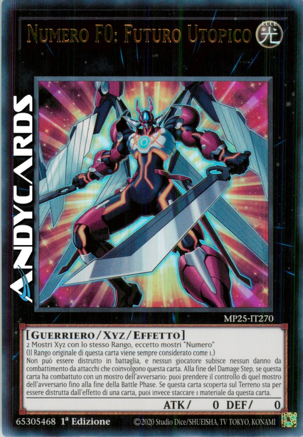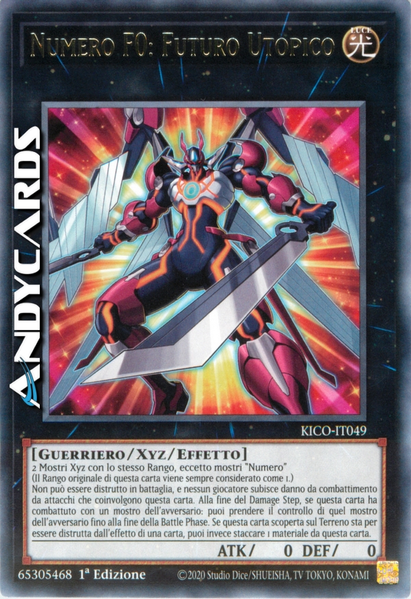 2 Mostri Xyz con lo stesso Rango, eccetto mostri "Numero" (Il Rango originale di questa carta viene sempre considerato come 1.) Non può essere distrutto in battaglia, e nessun giocatore subisce danno da combattimento da attacchi che coinvolgono questa carta. Alla fine del Damage Step, se questa carta ha combattuto con un mostro dell'avversario: puoi prendere il controllo di quel mostro dell'avversario fino alla fine della Battle Phase. Se questa carta scoperta sul Terreno sta per essere distrutta dall'effetto di una carta, puoi invece staccare 1 materiale da questa carta.