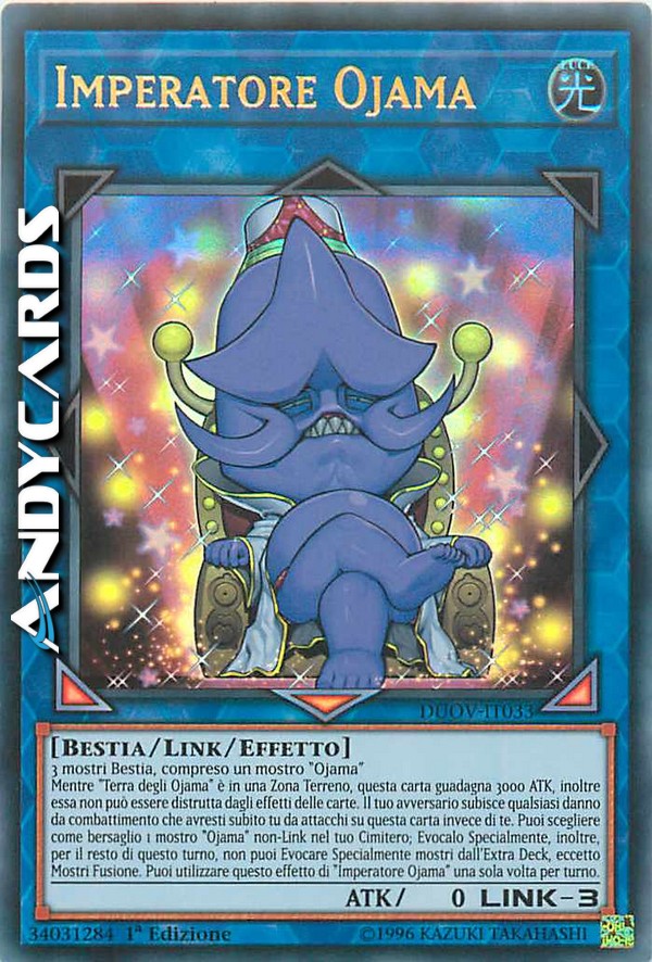 Mentre "Terra degli Ojama" è in una Zona Terreno, questa carta guadagna 3000 ATK, inoltre essa non può essere distrutta dagli effetti delle carte. Il tuo avversario subisce qualsiasi danno da combattimento che avresti subito tu da attacchi su questa carta invece di te. Puoi scegliere come bersaglio 1 mostro "Ojama" non-Link nel tuo Cimitero; Evocalo Specialmente, inoltre, per il resto di questo turno, non puoi Evocare Specialmente mostri dall'Extra Deck, eccetto Mostri Fusione. Puoi utilizzare questo effetto di "Imperatore Ojama" una sola volta per turno.