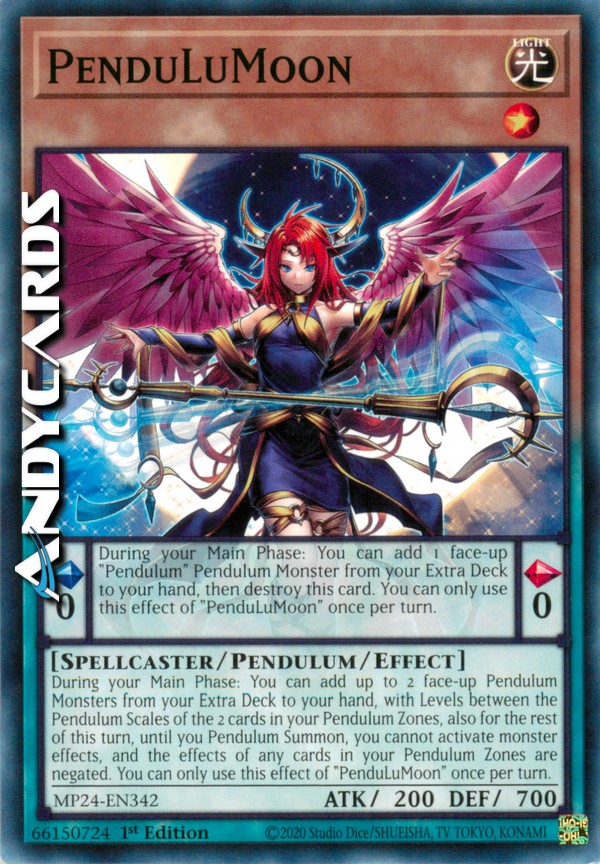 Effetto Pendulum: Durante la tua Main Phase: puoi aggiungere 1 Mostro Pendulum "Pendulum" scoperto dal tuo Extra Deck alla tua mano, poi distruggere questa carta. Puoi utilizzare questo effetto di "PenduLuMoon" una sola volta per turno.