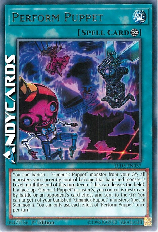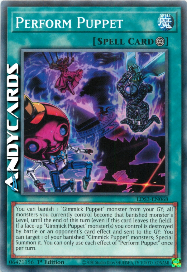 You can banish 1 "Gimmick Puppet" monster from your GY; all monsters you currently control become that banished monster's Level, until the end of this turn (even if this card leaves the field). If a face-up "Gimmick Puppet" monster(s) you control is destroyed by battle or an opponent's card effect and sent to the GY: You can target 1 of your banished "Gimmick Puppet" monsters; Special Summon it. You can only use each effect of "Perform Puppet" once per turn.