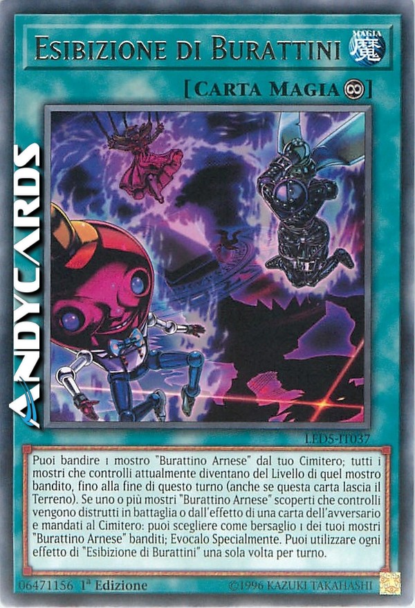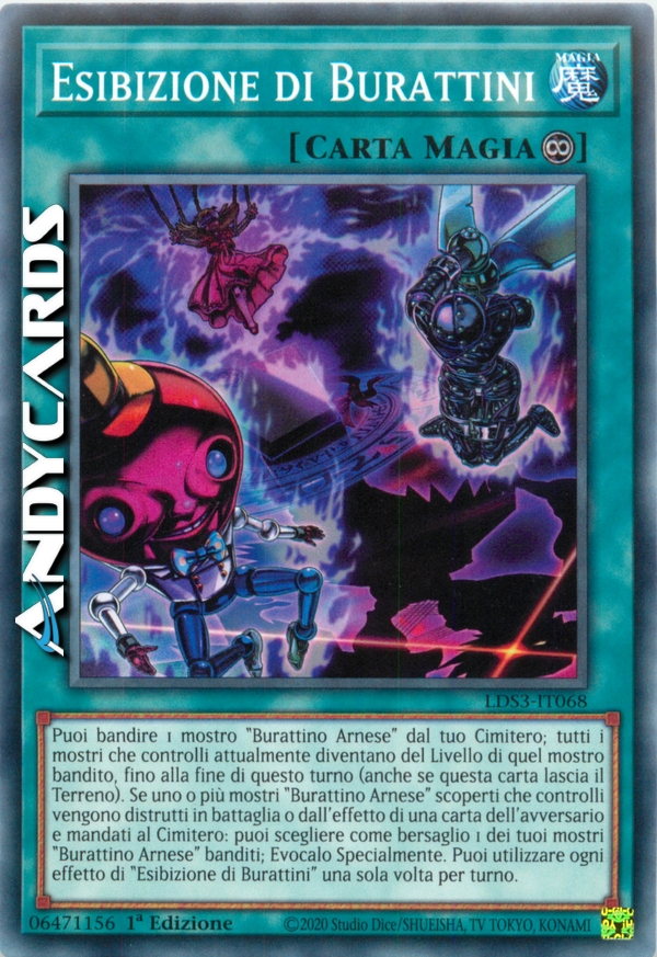 Puoi bandire 1 mostro "Burattino Arnese" dal tuo Cimitero; tutti i mostri che controlli attualmente diventano del Livello di quel mostro bandito, fino alla fine di questo turno (anche se questa carta lascia il Terreno). Se uno o più mostri "Burattino Arnese" scoperti che controlli vengono distrutti in battaglia o dall'effetto di una carta dell'avversario e mandati al Cimitero: puoi scegliere come bersaglio 1 dei tuoi mostri "Burattino Arnese" banditi; Evocalo Specialmente. Puoi utilizzare ogni effetto di "Esibizione di Burattini" una sola volta per turno.