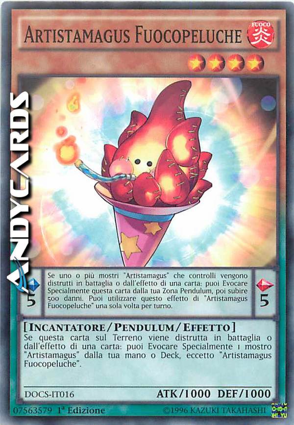 Se questa carta sul Terreno viene distrutta in battaglia o dall'effetto di una carta: puoi Evocare Specialmente 1 mostro "Artistamagus" dalla tua mano o Deck, eccetto "Artistamagus Fuocopeluche".  Effetto Pendulum: Se uno o più mostri "Artistamagus" che controlli vengono distrutti in battaglia o dall'effetto di una carta: puoi Evocare Specialmente questa carta dalla tua Zona Pendulum, poi subire 500 danni. Puoi utilizzare questo effetto di "Artistamagus Fuocopeluche" una sola volta per turno.