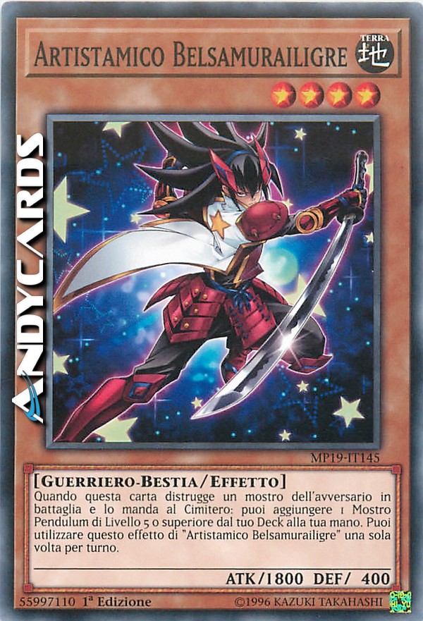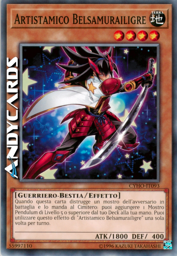 Quando questa carta distrugge un mostro dell'avversario in battaglia e lo manda al Cimitero: puoi aggiungere 1 Mostro Pendulum di Livello 5 o superiore dal tuo Deck alla tua mano. Puoi utilizzare questo effetto di "Artistamico Belsamurailigre" una sola volta per turno.