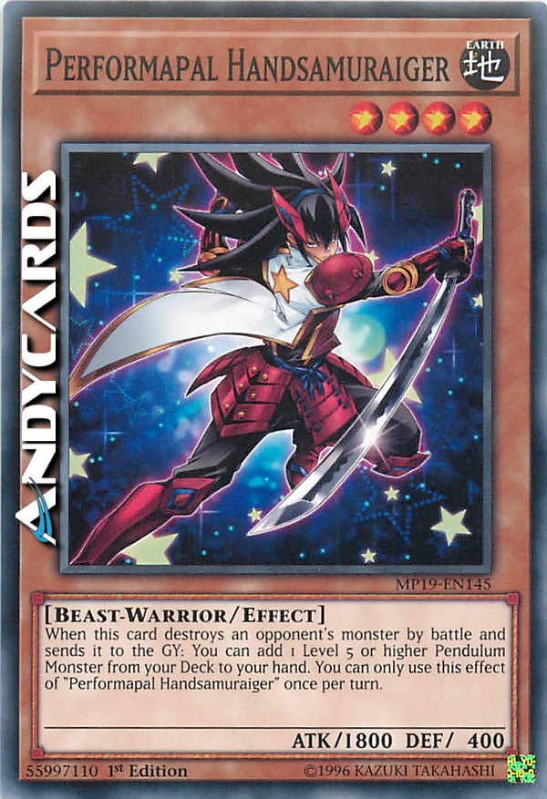 When this card destroys an opponent's monster by battle and sends it to the GY: You can add 1 Level 5 or higher Pendulum Monster from your Deck to your hand. You can only use this effect of "Performapal Handsamuraiger" once per turn.