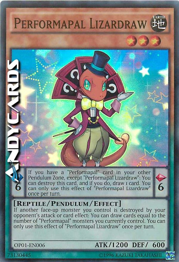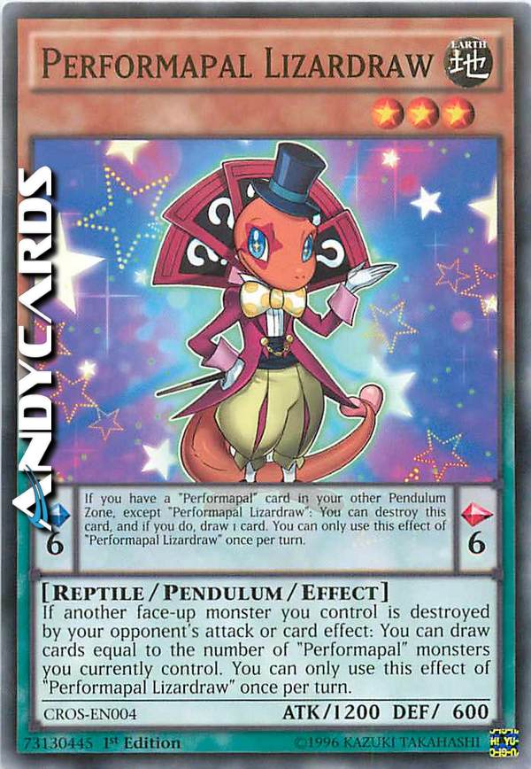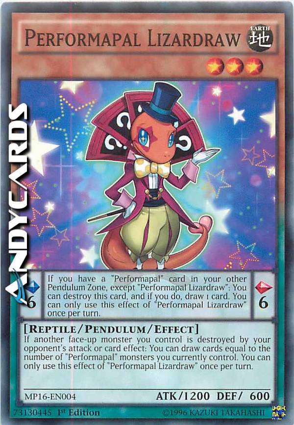 If another face-up monster you control is destroyed by your opponent's attack or card effect: You can draw cards equal to the number of "Performapal" monsters you currently control. You can only use this effect of "Performapal Lizardraw" once per turn. Pendulum Effect: If you have a "Performapal" card in your other Pendulum Zone, except "Performapal Lizardraw": You can destroy this card, and if you do, draw 1 card. You can only use this effect of "Performapal Lizardraw" once per turn.