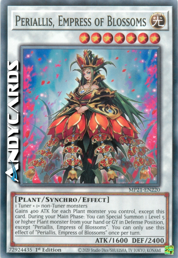 Gains 400 ATK for each Plant monster you control, except this card. During your Main Phase: You can Special Summon 1 Level 5 or higher Plant monster from your hand or GY in Defense Position, except "Periallis, Empress of Blossoms". You can only use this effect of "Periallis, Empress of Blossoms" once per turn.