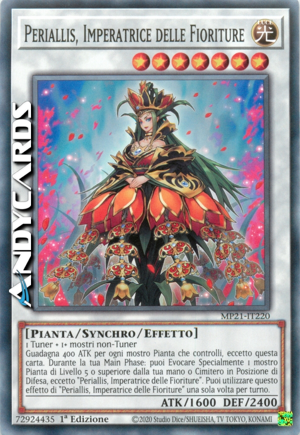Guadagna 400 ATK per ogni mostro Pianta che controlli, eccetto questa carta. Durante la tua Main Phase: puoi Evocare Specialmente 1 mostro Pianta di Livello 5 o superiore dalla tua mano o Cimitero in Posizione di Difesa, eccetto "Periallis, Imperatrice delle Fioriture". Puoi utilizzare questo effetto di "Periallis, Imperatrice delle Fioriture" una sola volta per turno.