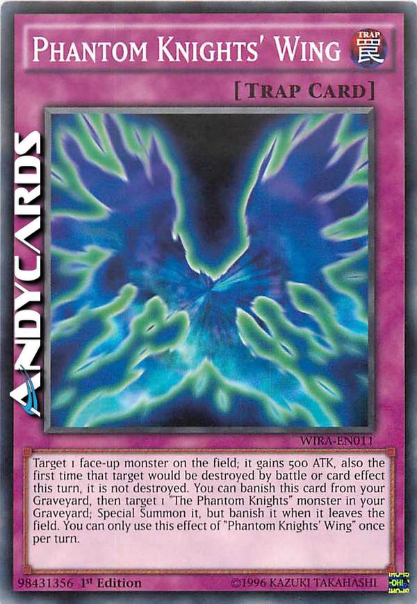 Target 1 face-up monster on the field; it gains 500 ATK, also the first time that target would be destroyed by battle or card effect this turn, it is not destroyed. You can banish this card from your Graveyard, then target 1 "The Phantom Knights" monster in your Graveyard; Special Summon it, but banish it when it leaves the field. You can only use this effect of "Phantom Knights' Wing" once per turn.