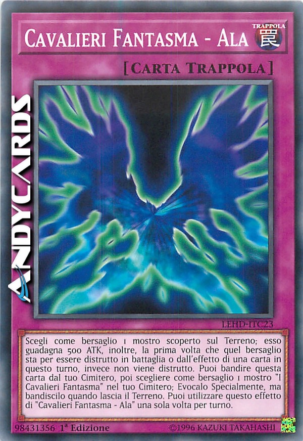 Scegli come bersaglio 1 mostro scoperto sul Terreno; esso guadagna 500 ATK, inoltre, la prima volta che quel bersaglio sta per essere distrutto in battaglia o dall'effetto di una carta in questo turno, invece non viene distrutto. Puoi bandire questa carta dal tuo Cimitero, poi scegliere come bersaglio 1 mostro "I Cavalieri Fantasma" nel tuo Cimitero; Evocalo Specialmente, ma bandiscilo quando lascia il Terreno. Puoi utilizzare questo effetto di "Cavalieri Fantasma - Ala" una sola volta per turno.