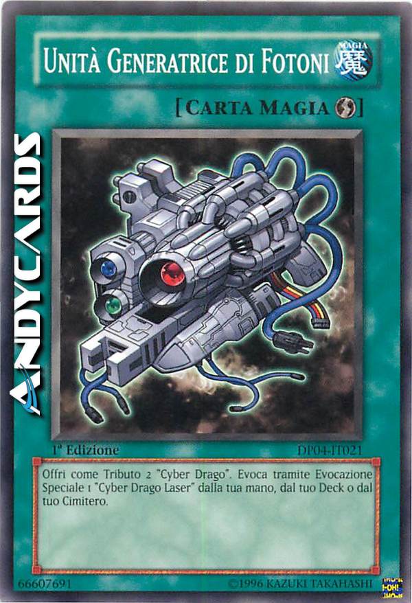 Offri come Tributo 2 "Cyber Drago" sul tuo Terreno per attivare questa carta. Evoca tramite Evocazione Speciale 1 "Cyber Drago Laser" dalla tua mano, dal tuo Deck o dal tuo Cimitero.