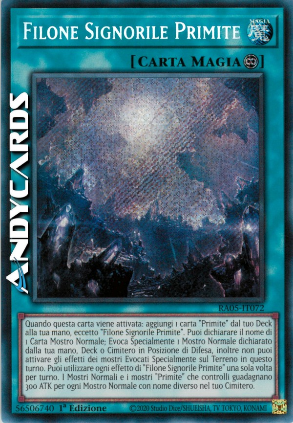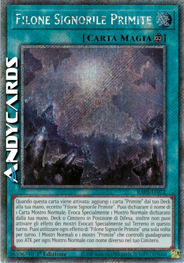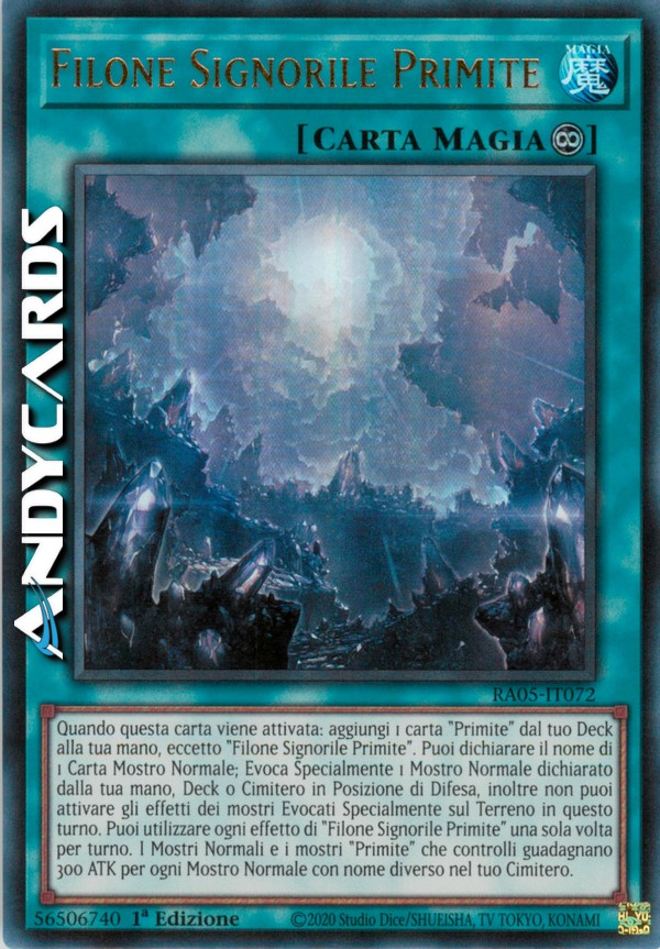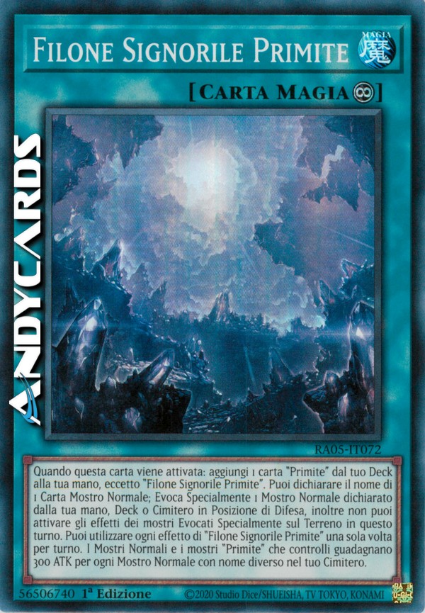 Quando questa carta viene attivata: aggiungi 1 carta "Primite" dal tuo Deck alla tua mano, eccetto "Filone Signorile Primite". Puoi dichiarare il nome di 1 Carta Mostro Normale; Evoca Specialmente 1 Mostro Normale dichiarato dalla tua mano, Deck o Cimitero in Posizione di Difesa, inoltre non puoi attivare gli effetti dei mostri Evocati Specialmente sul Terreno in questo turno. Puoi utilizzare ogni effetto di "Filone Signorile Primite" una sola volta per turno. I Mostri Normali e i mostri "Primite" che controlli guadagnano 300 ATK per ogni Mostro Normale con nome diverso nel tuo Cimitero.