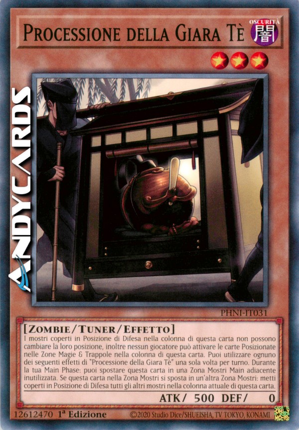 I mostri coperti in Posizione di Difesa nella colonna di questa carta non possono cambiare la loro posizione, inoltre nessun giocatore può attivare le carte Posizionate nelle Zone Magie & Trappole nella colonna di questa carta. Puoi utilizzare ognuno dei seguenti effetti di "Processione della Giara Tè" una sola volta per turno. Durante la tua Main Phase: puoi spostare questa carta in una Zona Mostri Main adiacente inutilizzata. Se questa carta nella Zona Mostri si sposta in un'altra Zona Mostri: metti coperti in Posizione di Difesa tutti gli altri mostri nella colonna attuale di questa carta.