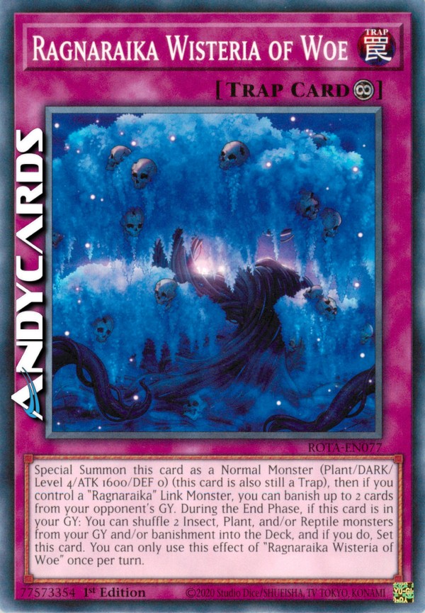 Special Summon this card as a Normal Monster (Plant/DARK/Level 4/ATK 1600/DEF 0) (this card is also still a Trap), then if you control a "Ragnaraika" Link Monster, you can banish up to 2 cards from your opponent's GY. During the End Phase, if this card is in your GY: You can shuffle 2 Insect, Plant, and/or Reptile monsters from your GY and/or banishment into the Deck, and if you do, Set this card. You can only use this effect of "Ragnaraika Wisteria of Woe" once per turn.