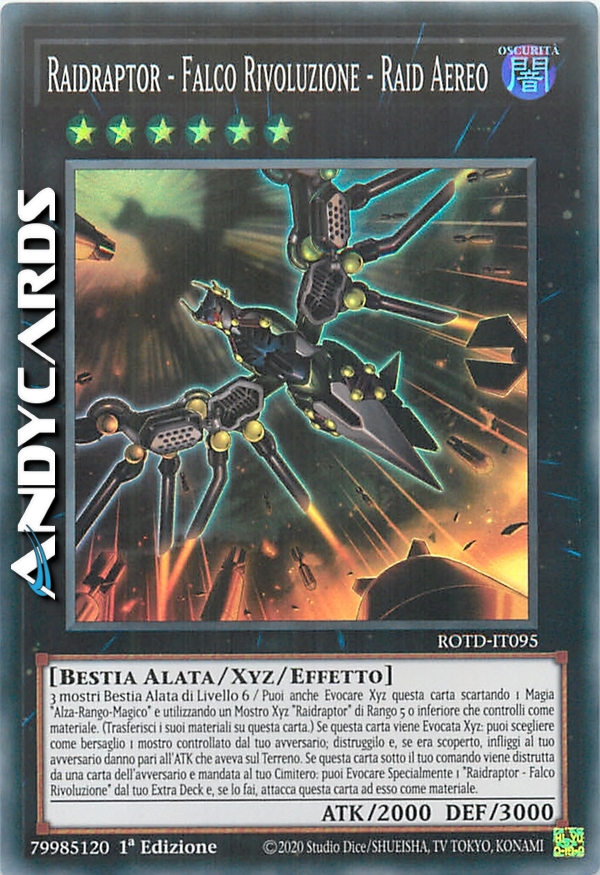 Puoi anche Evocare Xyz questa carta scartando 1 Magia "Alza-Rango-Magico" e utilizzando un Mostro Xyz "Raidraptor" di Rango 5 o inferiore che controlli come materiale. (Trasferisci i suoi materiali su questa carta.) Se questa carta viene Evocata Xyz: puoi scegliere come bersaglio 1 mostro controllato dal tuo avversario; distruggilo e, se era scoperto, infliggi al tuo avversario danno pari all'ATK che aveva sul Terreno. Se questa carta sotto il tuo comando viene distrutta da una carta dell'avversario e mandata al tuo Cimitero: puoi Evocare Specialmente 1 "Raidraptor - Falco Rivoluzione" dal tuo Extra Deck e, se lo fai, attacca questa carta ad esso come materiale.