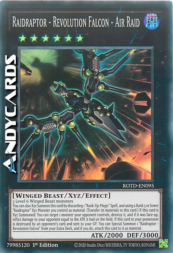 You can also Xyz Summon this card by discarding 1 "Rank-Up-Magic" Spell, and using a Rank 5 or lower "Raidraptor" Xyz Monster you control as material. (Transfer its materials to this card.) If this card is Xyz Summoned: You can target 1 monster your opponent controls; destroy it, and if it was face-up, inflict damage to your opponent equal to the ATK it had on the field. If this card in your possession is destroyed by an opponent's card and sent to your GY: You can Special Summon 1 "Raidraptor - Revolution Falcon" from your Extra Deck, and if you do, attach this card to it as material.