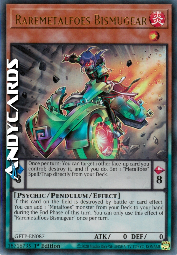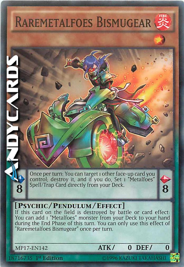 If this card on the field is destroyed by battle or card effect: You can add 1 "Metalfoes" monster from your Deck to your hand during the End Phase of this turn. You can only use this effect of "Raremetalfoes Bismugear" once per turn. Pendulum Effect: Once per turn: You can target 1 other face-up card you control; destroy it, and if you do, Set 1 "Metalfoes" Spell/Trap Card directly from your Deck.