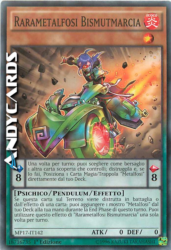 Se questa carta sul Terreno viene distrutta in battaglia o dall'effetto di una carta: puoi aggiungere 1 mostro "Metalfosi" dal tuo Deck alla tua mano durante la End Phase di questo turno. Puoi utilizzare questo effetto di "Rarametalfosi Bismutmarcia" una sola volta per turno.