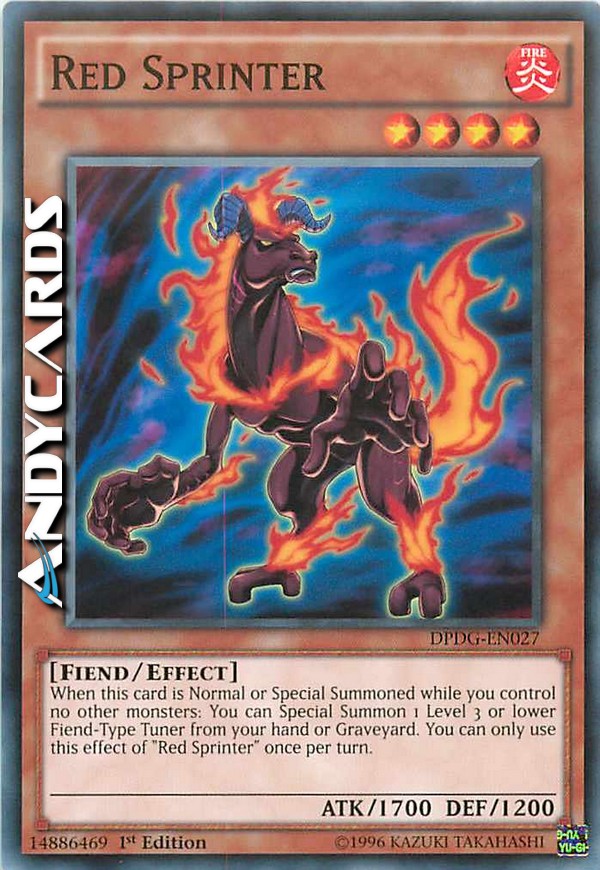 Quando questa carta viene Evocata Normalmente o Specialmente mentre non controlli nessun altro mostro: puoi Evocare Specialmente 1 mostro Tuner di Tipo Demone di Livello 3 o inferiore dalla tua mano o Cimitero. Puoi utilizzare questo effetto di "Velocista Rosso" una sola volta per turno.