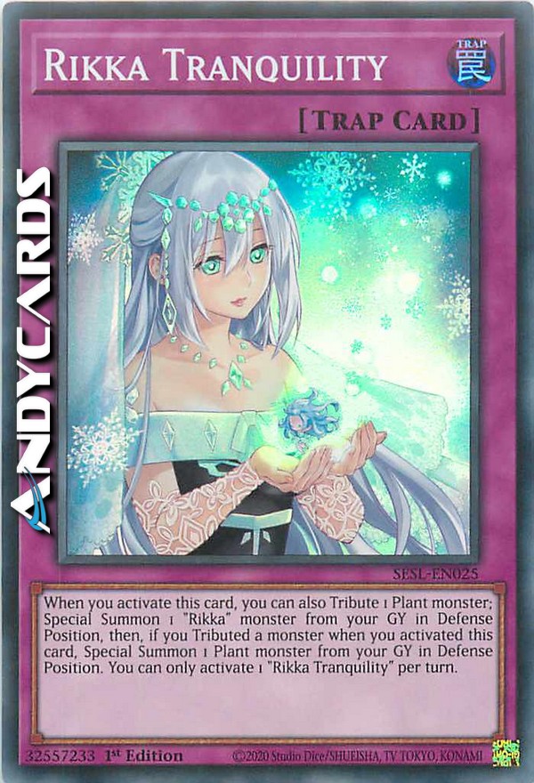 Quando attivi questa carta, puoi anche offrire come Tributo 1 mostro Pianta; Evoca Specialmente 1 mostro "Rikka" dal tuo Cimitero in Posizione di Difesa, poi, se hai offerto come Tributo un mostro quando hai attivato questa carta, Evoca Specialmente 1 mostro Pianta dal tuo Cimitero in Posizione di Difesa. Puoi attivare solo 1 "Tranquillità Rikka" per turno.