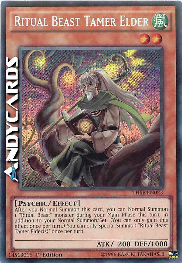 After you Normal Summon this card, you can Normal Summon 1 "Ritual Beast" monster during your Main Phase this turn, in addition to your Normal Summon/Set. (You can only gain this effect once per turn.) You can only Special Summon "Ritual Beast Tamer Elder(s)" once per turn.