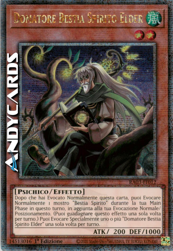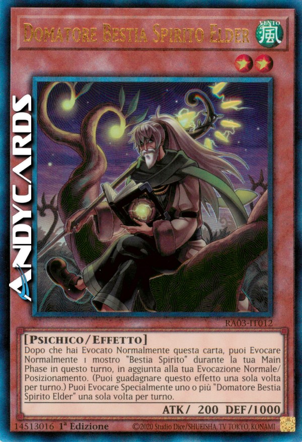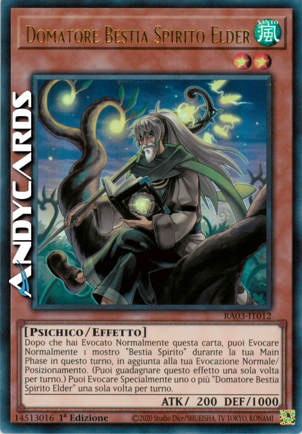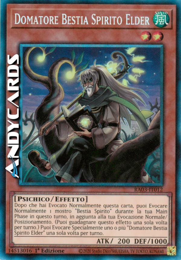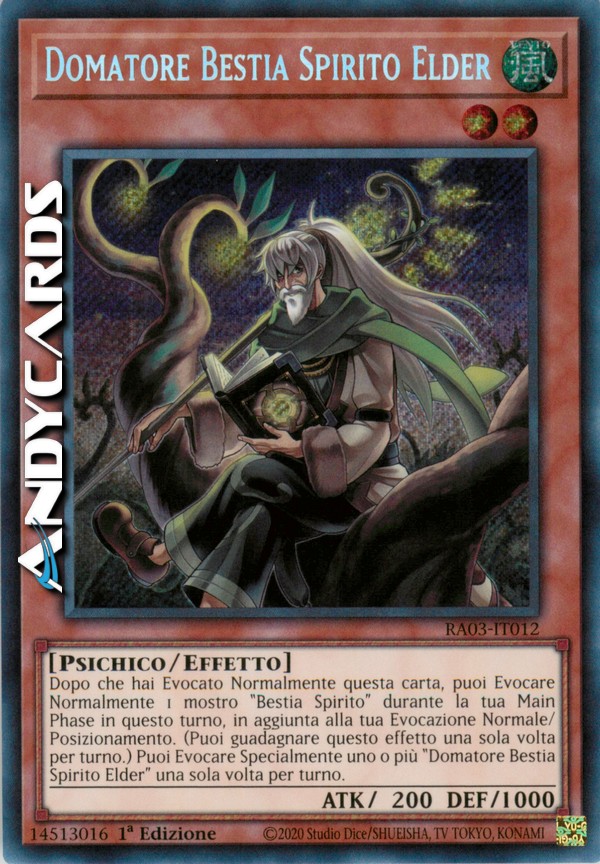 Dopo che hai Evocato Normalmente questa carta, puoi Evocare Normalmente 1 mostro "Bestia Spirito" durante la tua Main Phase in questo turno, in aggiunta alla tua Evocazione Normale/Posizionamento. (Puoi guadagnare questo effetto una sola volta per turno.) Puoi Evocare Specialmente uno o più "Domatore Bestia Spirito Elder" una sola volta per turno.
