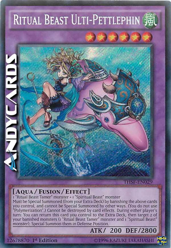 1 "Ritual Beast Tamer" monster + 1 "Spiritual Beast" monster 'Must be Special Summoned (from your Extra Deck) by banishing the above cards you control, and cannot be Special Summoned by other ways. (You do not use "Polymerization".) Cannot be destroyed by card effects. During either player's turn: You can return this card you control to the Extra Deck, then target 2 of your banished monsters (1 "Ritual Beast Tamer" monster and 1 "Spiritual Beast" monster); Special Summon them in Defense Position.