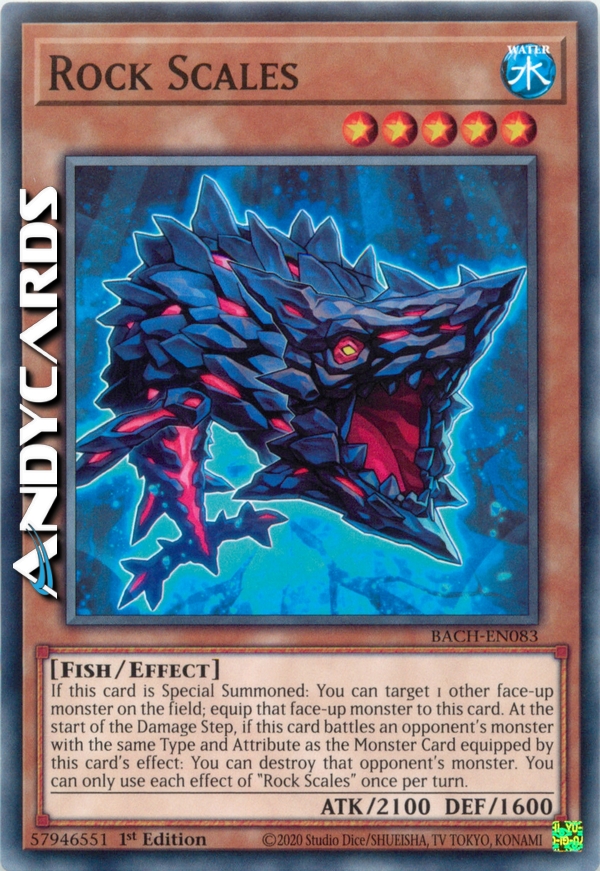 If this card is Special Summoned: You can target 1 other face-up monster on the field; equip that face-up monster to this card. At the start of the Damage Step, if this card battles an opponent's monster with the same Type and Attribute as the Monster Card equipped by this card's effect: You can destroy that opponent's monster. You can only use each effect of "Rock Scales" once per turn.