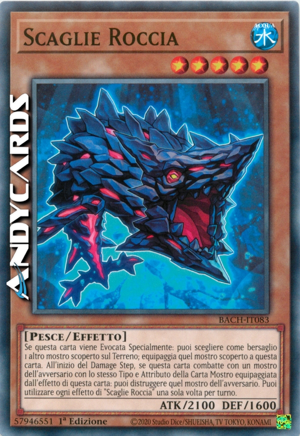 Se questa carta viene Evocata Specialmente: puoi scegliere come bersaglio 1 altro mostro scoperto sul Terreno; equipaggia quel mostro scoperto a questa carta. All'inizio del Damage Step, se questa carta combatte con un mostro dell'avversario con lo stesso Tipo e Attributo della Carta Mostro equipaggiata dall'effetto di questa carta: puoi distruggere quel mostro dell'avversario. Puoi utilizzare ogni effetto di "Scaglie Roccia" una sola volta per turno.