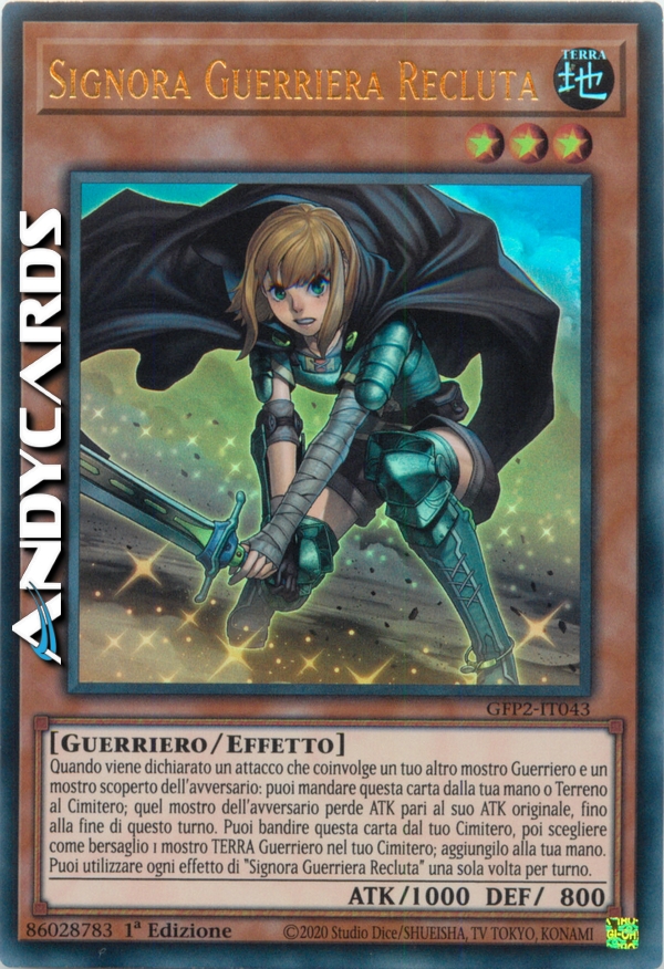 Quando viene dichiarato un attacco che coinvolge un tuo altro mostro Guerriero e un mostro scoperto dell'avversario: puoi mandare questa carta dalla tua mano o Terreno al Cimitero; quel mostro dell'avversario perde ATK pari al suo ATK originale, fino alla fine di questo turno. Puoi bandire questa carta dal tuo Cimitero, poi scegliere come bersaglio 1 mostro TERRA Guerriero nel tuo Cimitero; aggiungilo alla tua mano. Puoi utilizzare ogni effetto di "Signora Guerriera Recluta" una sola volta per turno.