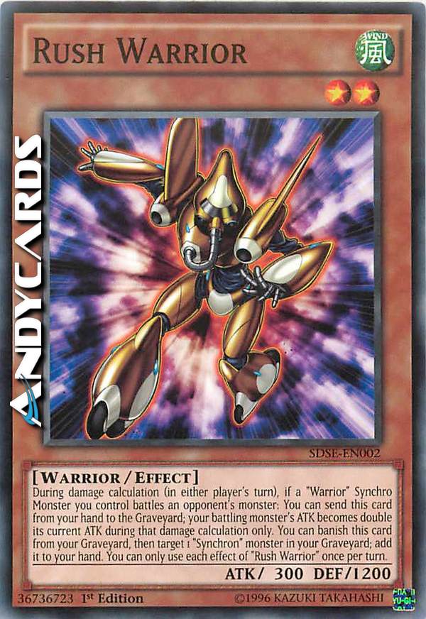During damage calculation (in either player's turn), if a "Warrior" Synchro Monster you control battles an opponent's monster: You can send this card from your hand to the Graveyard; your battling monster's ATK becomes double its current ATK during that damage calculation only. You can banish this card from your Graveyard, then target 1 "Synchron" monster in your Graveyard; add it to your hand. You can only use each effect of "Rush Warrior" once per turn.