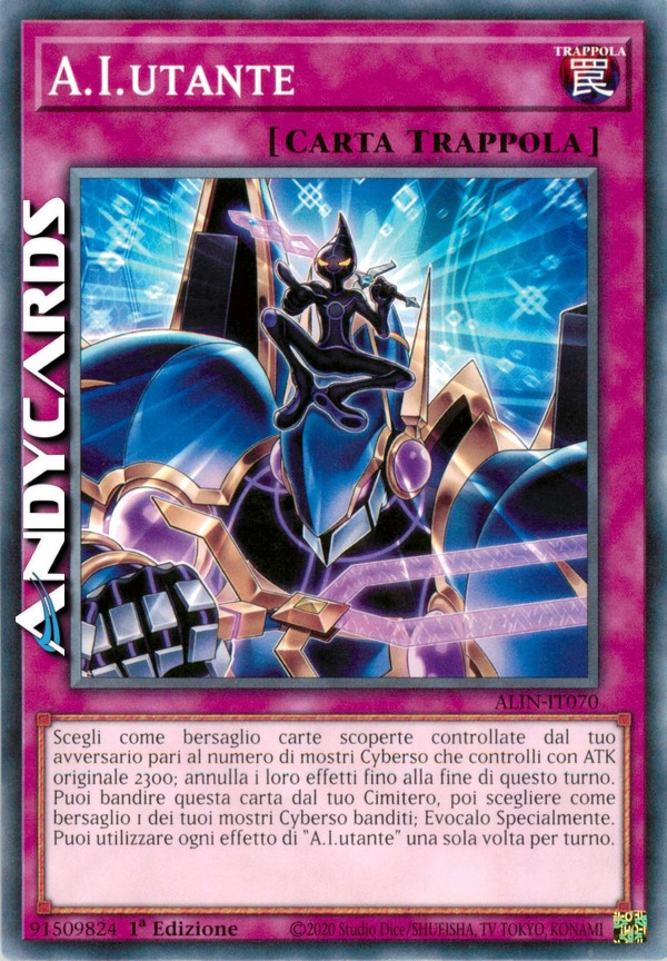 Scegli come bersaglio carte scoperte controllate dal tuo avversario pari al numero di mostri Cyberso che controlli con ATK originale 2300; annulla i loro effetti fino alla fine di questo turno. Puoi bandire questa carta dal tuo Cimitero, poi scegliere come bersaglio 1 dei tuoi mostri Cyberso banditi; Evocalo Specialmente. Puoi utilizzare ogni effetto di "A.I.utante" una sola volta per turno.