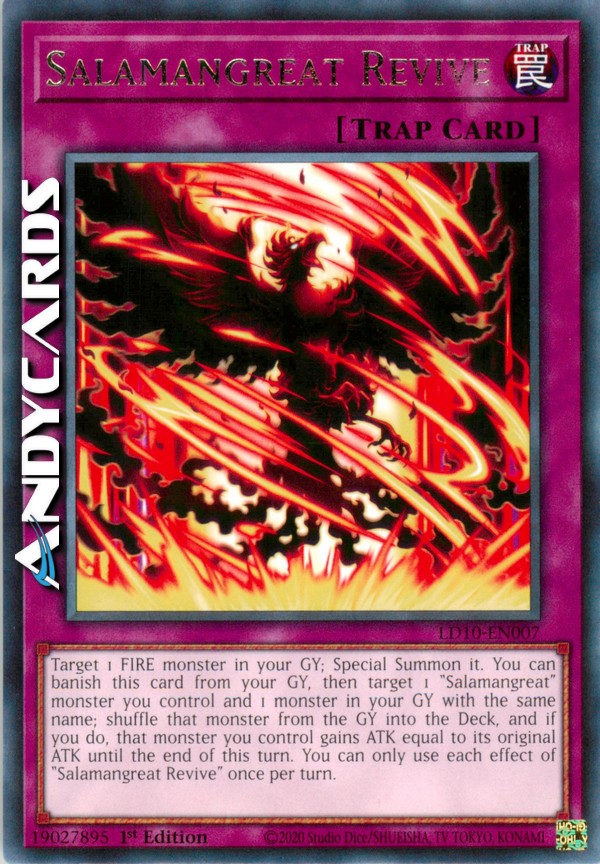 Scegli come bersaglio 1 mostro FUOCO nel tuo Cimitero; Evocalo Specialmente. Puoi bandire questa carta dal tuo Cimitero, poi scegliere come bersaglio 1 mostro "Salamagna" che controlli e 1 mostro nel tuo Cimitero con lo stesso nome; mischia quel mostro dal Cimitero nel Deck e, se lo fai, quel mostro che controlli guadagna ATK pari al suo ATK originale fino alla fine di questo turno. Puoi utilizzare ogni effetto di "Rivivificazione Salamagna" una sola volta per turno.