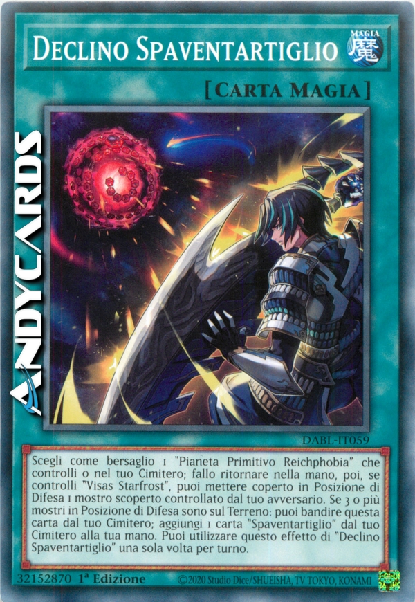 Scegli come bersaglio 1 "Pianeta Primitivo Reichphobia" che controlli o nel tuo Cimitero; fallo ritornare nella mano, poi, se controlli "Visas Starfrost", puoi mettere coperto in Posizione di Difesa 1 mostro scoperto controllato dal tuo avversario. Se 3 o più mostri in Posizione di Difesa sono sul Terreno: puoi bandire questa carta dal tuo Cimitero; aggiungi 1 carta "Spaventartiglio" dal tuo Cimitero alla tua mano. Puoi utilizzare questo effetto di "Declino Spaventartiglio" una sola volta per turno.