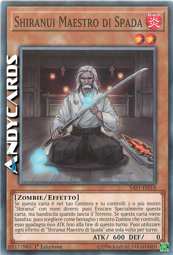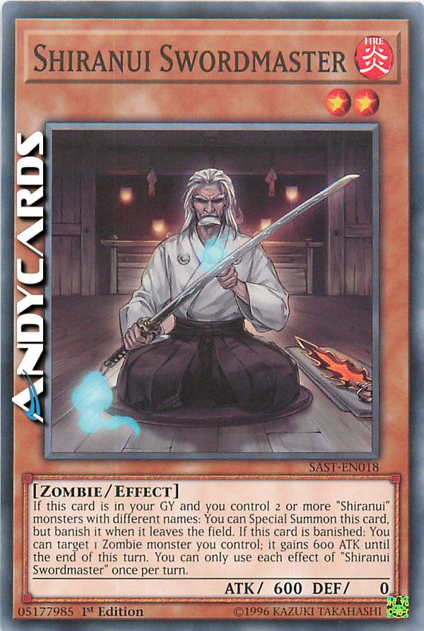 Se questa carta è nel tuo Cimitero e tu controlli 2 o più mostri "Shiranui" con nomi diversi: puoi Evocare Specialmente questa carta, ma bandiscila quando lascia il Terreno. Se questa carta viene bandita: puoi scegliere come bersaglio 1 mostro Zombie che controlli; esso guadagna 600 ATK fino alla fine di questo turno. Puoi utilizzare ogni effetto di "Shiranui Maestro di Spada" una sola volta per turno.