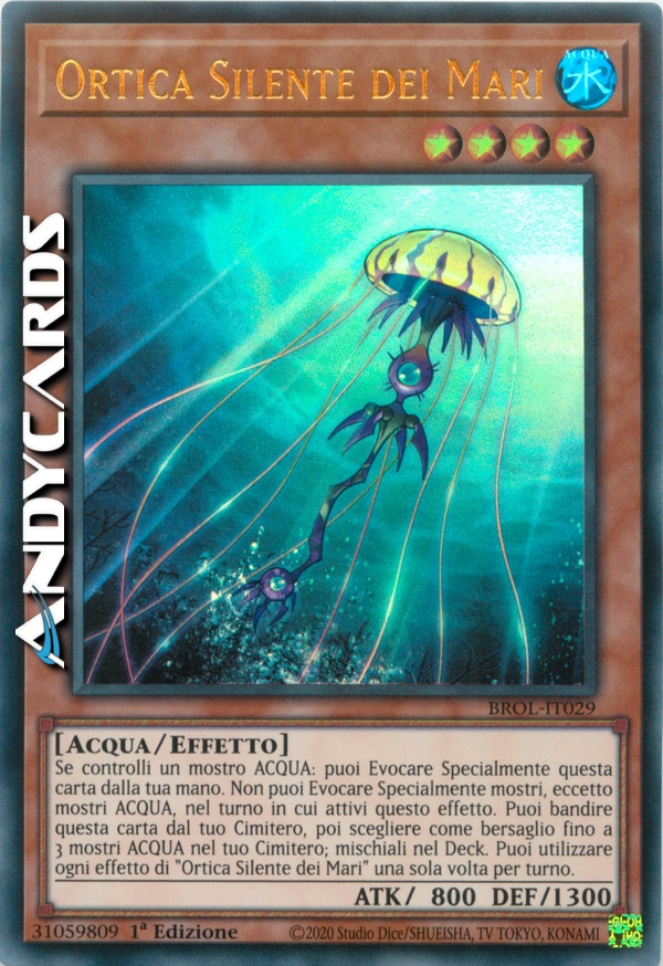 Se controlli un mostro ACQUA: puoi Evocare Specialmente questa carta dalla tua mano. Non puoi Evocare Specialmente mostri, eccetto mostri ACQUA, nel turno in cui attivi questo effetto. Puoi bandire questa carta dal tuo Cimitero, poi scegliere come bersaglio fino a 3 mostri ACQUA nel tuo Cimitero; mischiali nel Deck. Puoi utilizzare ogni effetto di "Ortica Silente dei Mari" una sola volta per turno.
