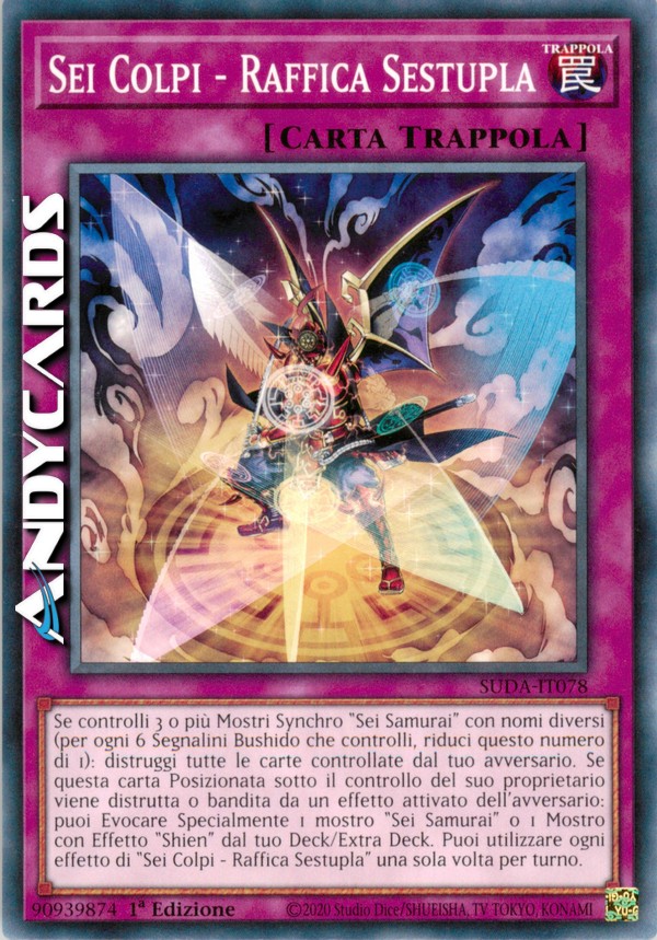 Se controlli 3 o più Mostri Synchro "Sei Samurai" con nomi diversi (per ogni 6 Segnalini Bushido che controlli, riduci questo numero di 1): distruggi tutte le carte controllate dal tuo avversario. Se questa carta Posizionata sotto il controllo del suo proprietario viene distrutta o bandita da un effetto attivato dell'avversario: puoi Evocare Specialmente 1 mostro "Sei Samurai" o 1 Mostro con Effetto "Shien" dal tuo Deck/Extra Deck. Puoi utilizzare ogni effetto di "Sei Colpi - Raffica Sestupla" una sola volta per turno.