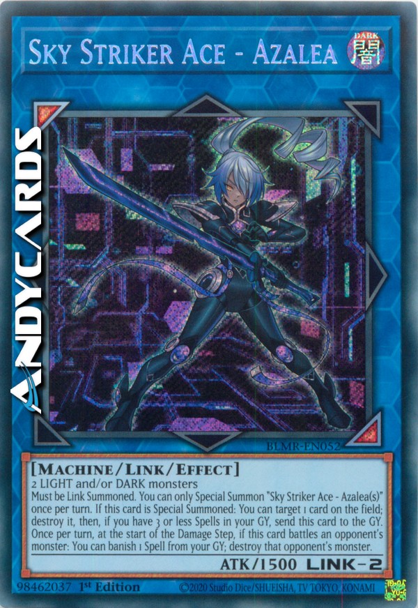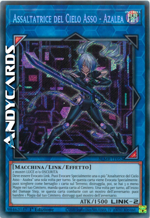Deve essere Evocato Link. Puoi Evocare Specialmente una o più "Assaltatrice del Cielo Asso - Azalea" una sola volta per turno. Se questa carta viene Evocata Specialmente: puoi scegliere come bersaglio 1 carta sul Terreno; distruggila, poi, se hai 3 o meno Magie nel tuo Cimitero, manda questa carta al Cimitero. Una volta per turno, all'inizio del Damage Step, se questa carta combatte con un mostro dell'avversario: puoi bandire 1 Magia dal tuo Cimitero; distruggi quel mostro dell'avversario.