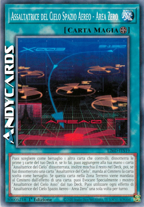 Puoi scegliere come bersaglio 1 altra carta che controlli; dissotterra le prime 3 carte del tuo Deck e, se lo fai, puoi aggiungere alla tua mano 1 carta "Assaltatrice del Cielo" dissotterrata, inoltre mischia il resto nel Deck, poi, se hai dissotterrato una carta "Assaltatrice del Cielo", manda al Cimitero la carta scelta come bersaglio. Se questa carta nella Zona Terreno viene mandata al Cimitero dall'effetto di una carta: puoi Evocare Specialmente 1 mostro "Assaltatrice del Cielo Asso" dal tuo Deck. Puoi utilizzare ogni effetto di "Assaltatrice del Cielo Spazio Aereo - Area Zero" una sola volta per turno.