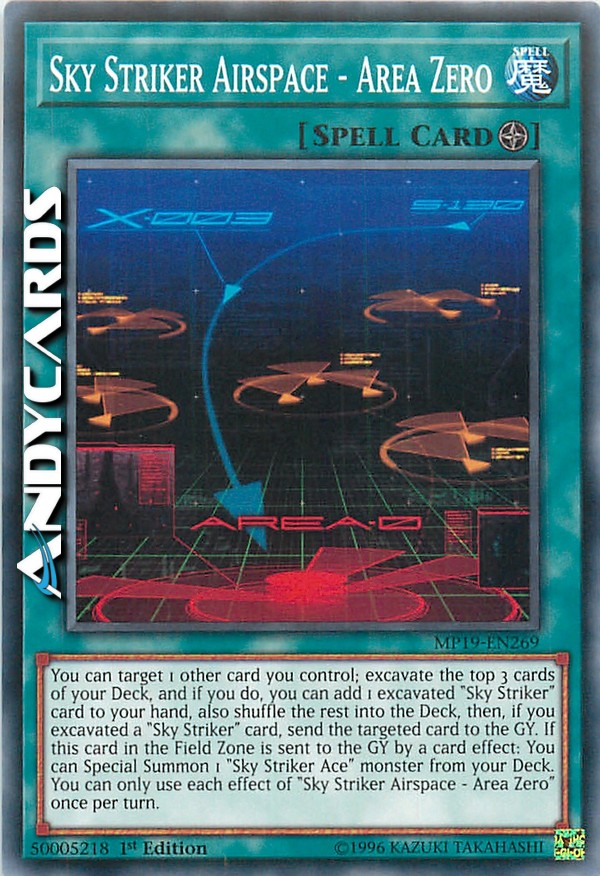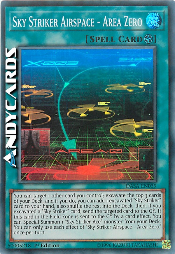 You can target 1 other card you control; excavate the top 3 cards of your Deck, and if you do, you can add 1 excavated "Sky Striker" card to your hand, also shuffle the rest into the Deck, then, if you excavated a "Sky Striker" card, send the targeted card to the GY. If this card in the Field Zone is sent to the GY by a card effect: You can Special Summon 1 "Sky Striker Ace" monster from your Deck. You can only use each effect of "Sky Striker Airspace - Area Zero" once per turn.