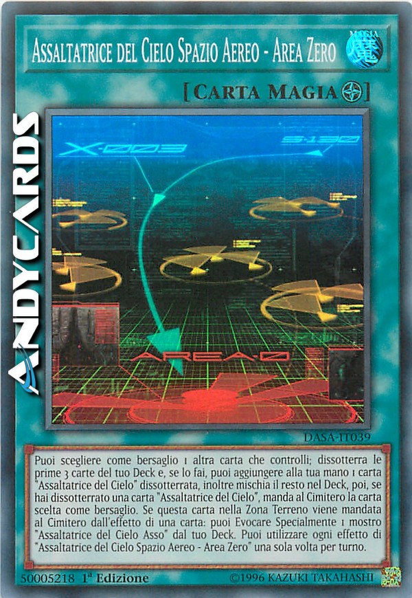 Puoi scegliere come bersaglio 1 altra carta che controlli; dissotterra le prime 3 carte del tuo Deck e, se lo fai, puoi aggiungere alla tua mano 1 carta "Assaltatrice del Cielo" dissotterrata, inoltre mischia il resto nel Deck, poi, se hai dissotterrato una carta "Assaltatrice del Cielo", manda al Cimitero la carta scelta come bersaglio. Se questa carta nella Zona Terreno viene mandata al Cimitero dall'effetto di una carta: puoi Evocare Specialmente 1 mostro "Assaltatrice del Cielo Asso" dal tuo Deck. Puoi utilizzare ogni effetto di "Assaltatrice del Cielo Spazio Aereo - Area Zero" una sola volta per turno.