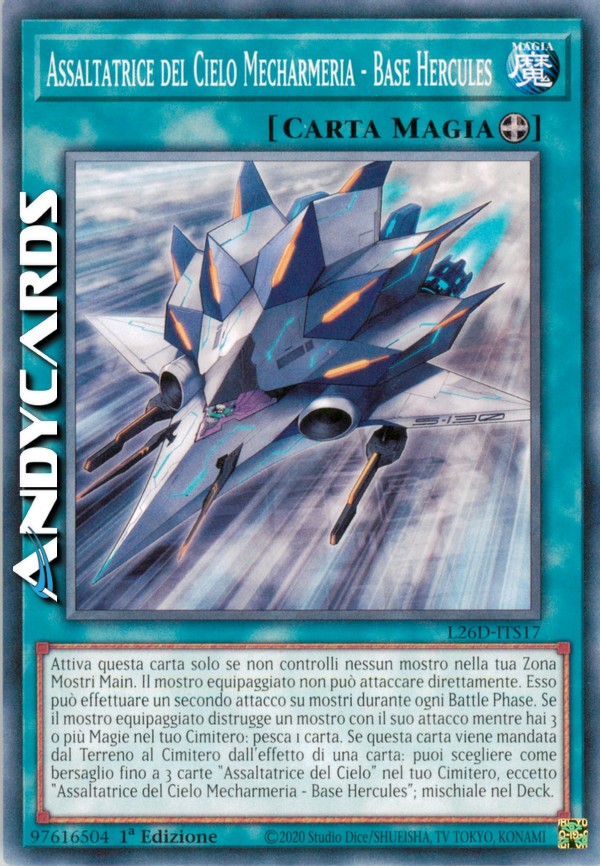 Attiva questa carta solo se non controlli nessun mostro nelle tue Zone Mostri Main. Il mostro equipaggiato non può attaccare direttamente. Esso può effettuare un secondo attacco su mostri durante ogni Battle Phase. Se il mostro equipaggiato distrugge un mostro con il suo attacco mentre hai 3 o più Magie nel tuo Cimitero: pesca 1 carta. Se questa carta viene mandata dal Terreno al Cimitero dall'effetto di una carta: puoi scegliere come bersaglio fino a 3 carte "Assaltatrice del Cielo" nel tuo Cimitero, eccetto "Assaltatrice del Cielo Mecharmeria - Base Hercules"; mischiale nel Deck.