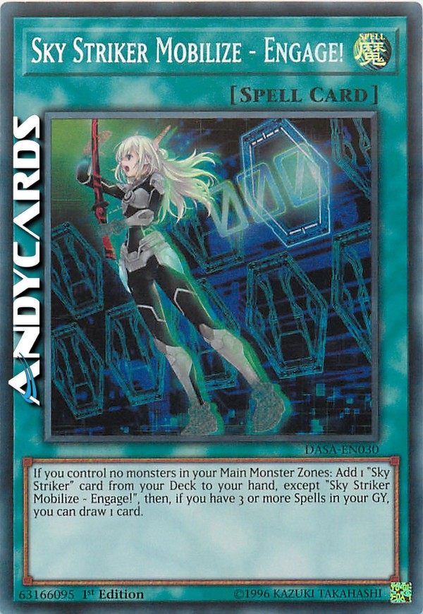If you control no monsters in your Main Monster Zone: Add 1 "Sky Striker" card from your Deck to your hand, except "Sky Striker Mobilize - Engage!", then, if you have 3 or more Spells in your GY, you can draw 1 card.